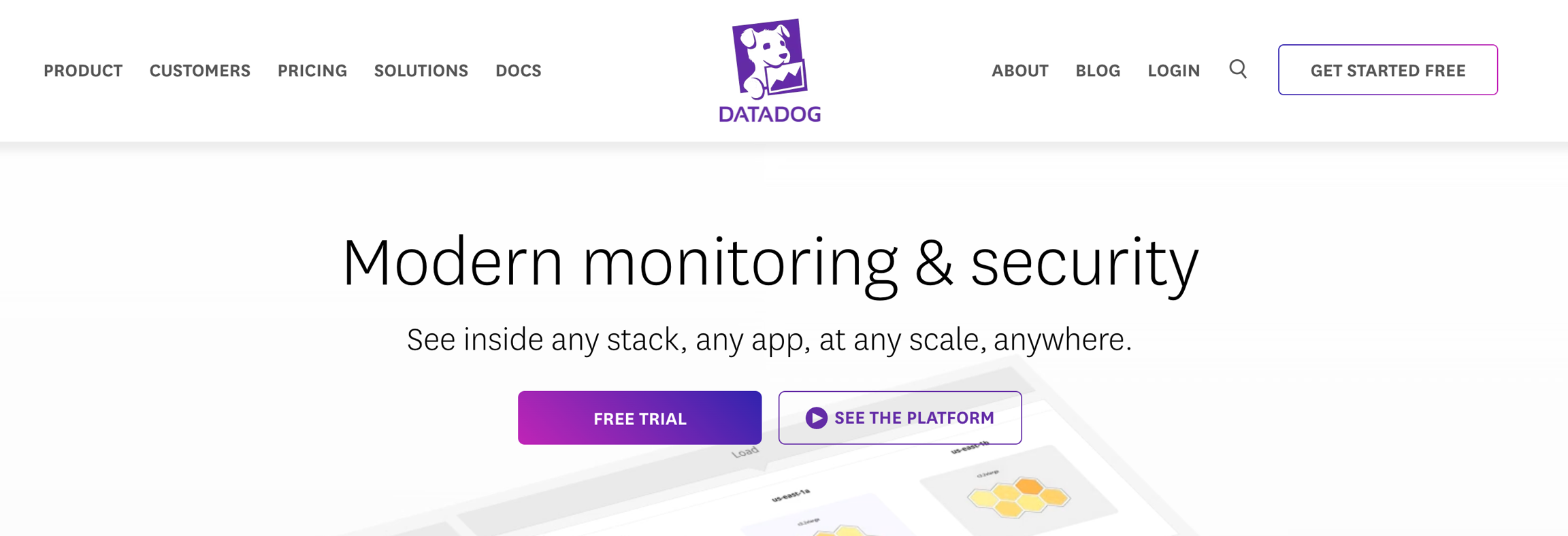 Homepage strapline: "See inside any stack, any app, at any scale, anywhere."