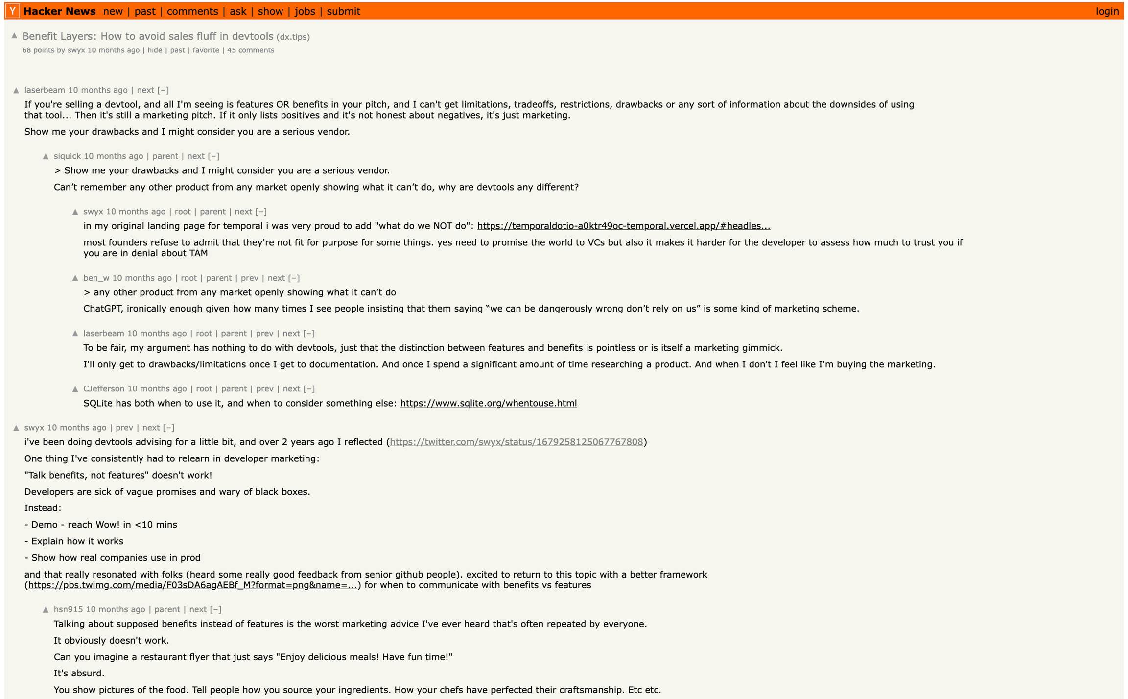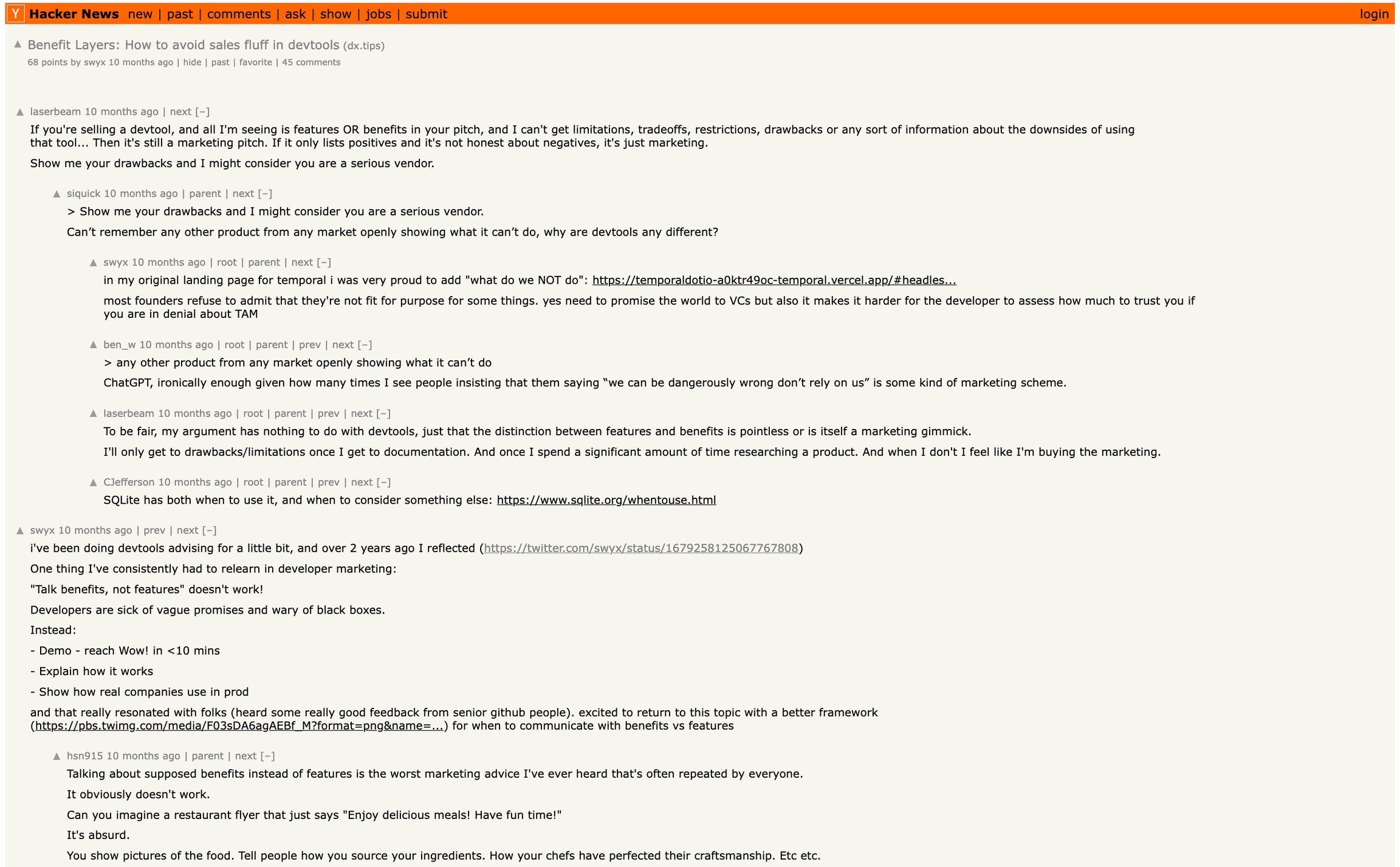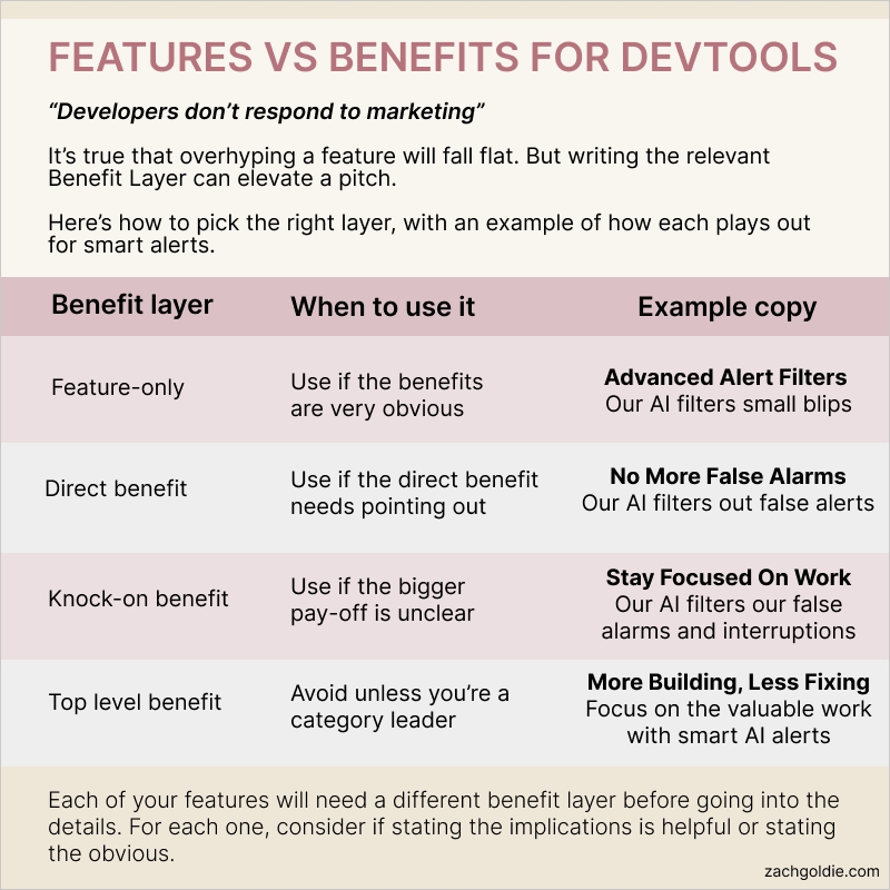 Here's why: Developers are particularly sensitive to vague language and need clear details to understand how a product works. Benefits-focused marketing can come across as insincere and make it difficult to evaluate a product's actual features and capabilities.